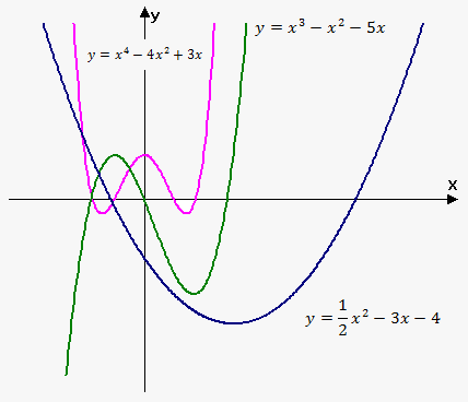 Graph of polynomial functions have different shapes. On the figure you can see graph of polynomials with degree $$${n}={2},{3},{4}$$$.